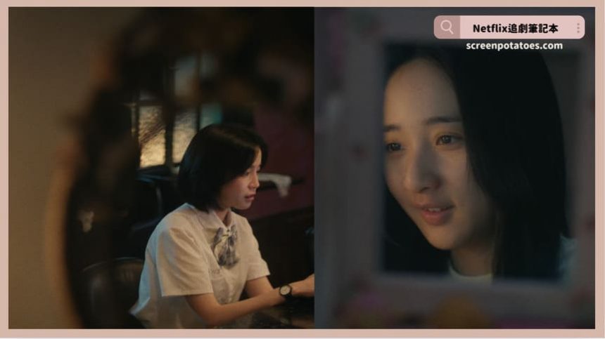 我蠻喜歡江曉彤和賴芸蓁兩人在MSN上的聊天時,導演透過鏡子裡的畫面展現出兩個角色那擁有的秘密和非真心話,當江曉彤說自己好像喜歡李壬曜時,導演用了鏡子裡的江曉彤呈現,而接下來導演就有著鏡子中的賴芸蓁,她自己想要回覆「不要喜歡李壬曜好不好」這段話並沒有傳送去,而是收回自己的內心話。通常在影視中或用鏡子來展現出人物角色的表情,很多時候是刻意要強調人物角色的心理狀態(而非表面的狀態),所以賴芸蓁本身的話語裡都是讓自己傷心但讓江曉彤幸福的那一面,真實的她和鏡中的她呈現一種口是心非的樣子。